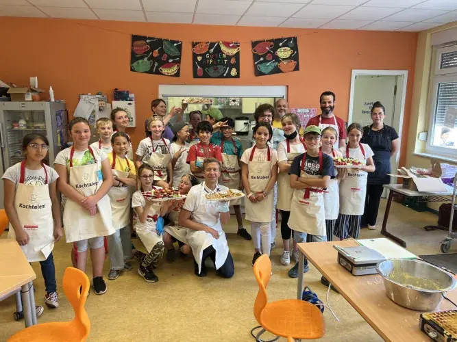 <h2>Gewinnerklasse des Rezeptwettbewerbs aus Einöd kocht mit Staatssekretär Thul</h2>